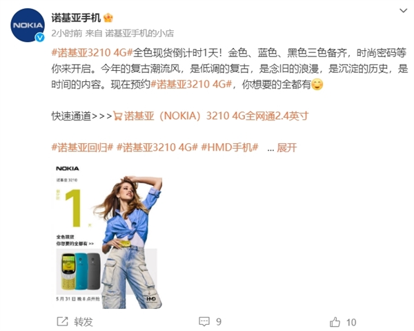 据诺基亚手机官微消息,诺基亚3210 4G将于5月31日晚8点,在各个官方旗舰店现货速发。