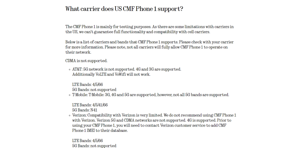 对于Verizon用户来说,情况同样不容乐观。CMF Phone 1不支持Verizon的5G或CDMA网络。虽然技术上可以在Verizon的4G网络上运行,但用户需要联系Verizon客服,将手机的IMEI注册到其数据库中,才能访问网络。
