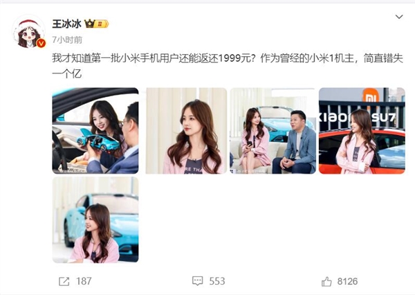 文章来源于互联网:快科技-王冰冰是小米手机一代机主:刚知道小米返还1999元 错失1个亿