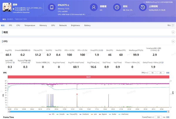 在《原神》60帧+极高画质设置下,iQOO Pad2 Pro在半小时跑图测试中,平均帧率达到了60.1帧;