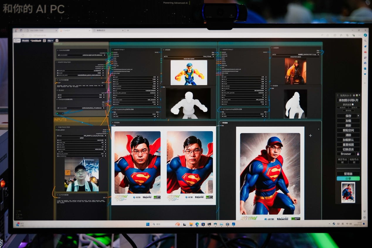 接下来看一下影驰的 RTX AI PC 体验区,在这里,可以体验到 GeForce RTX 40 系列 GPU 强大本地算力加持下的 ComfyUI,NVIDIA Canvas 等 AI 应用。值得一提的是,Stable Diffusion 中两款最受欢迎的应用 Automatic 1111 和 ComfyUI 现在都已经支持通过 TensorRT 加速,可以在原始软件性能的基础上提升至多 60%。