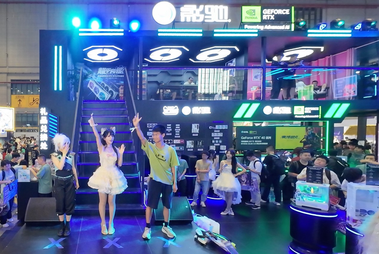 另一个高颜值聚集地,就是本次影驰的舞台区域了,真人星曜娘现场献舞,还有 showgirl 们带来的现场舞蹈教学互动,参与互动就还能获得相应的礼品,可以说是双重福利了。