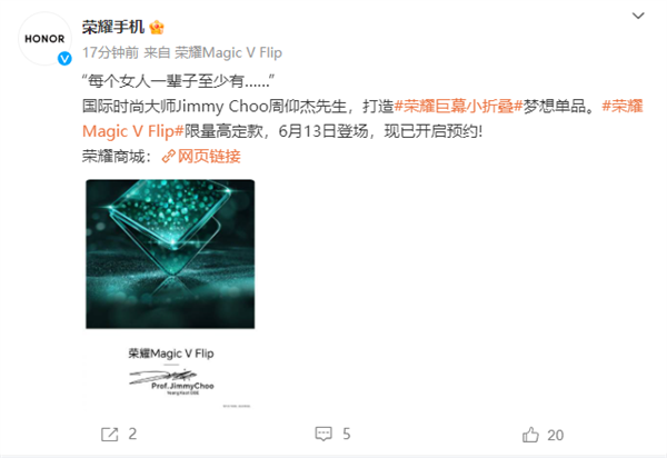 今日,荣耀手机宣布,荣耀Magic V Flip限量高定款将于6月13日登场,该机由国际时尚大师Jimmy Choo周仰杰打造。