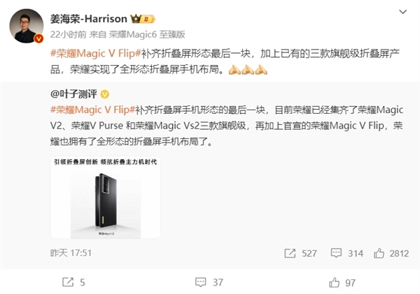 正如荣耀终端有限公司中国区CMO姜海荣所言:“荣耀Magic V Flip补齐折叠屏形态最后一块(拼图),加上已有的三款旗舰级折叠屏产品,荣耀实现了全形态折叠屏手机布局”。
