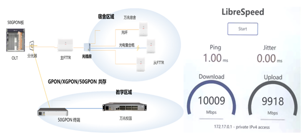 荆州移动在原有校园FTTR网络的基础上,对局端网络进行了50G PON升级,通过端到端F5G-A技术,实现了有线网络下行速率达到万兆的突破。