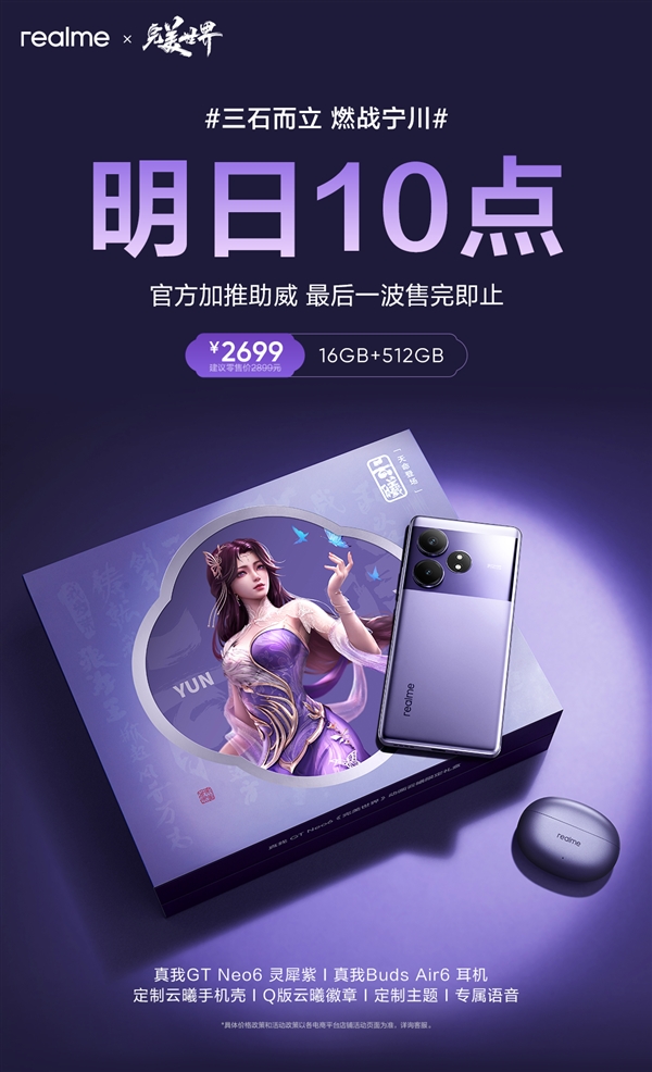快科技6月6日消息,真我预告,真我GT Neo6云曦限定礼盒将在明天开启最后一波销售,售价是2699元,售完即止。