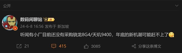 快科技6月8日消息,据知名数码博主“数码闲聊站”爆料,小厂目前还没有采购骁龙8 Gen4/天玑9400芯片,年底的新机潮可能赶不上了。