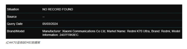快科技6月9日消息,近日Redmi K70至尊版在IMEI数据库中现身,具体型号为“2407FRK8EC”。