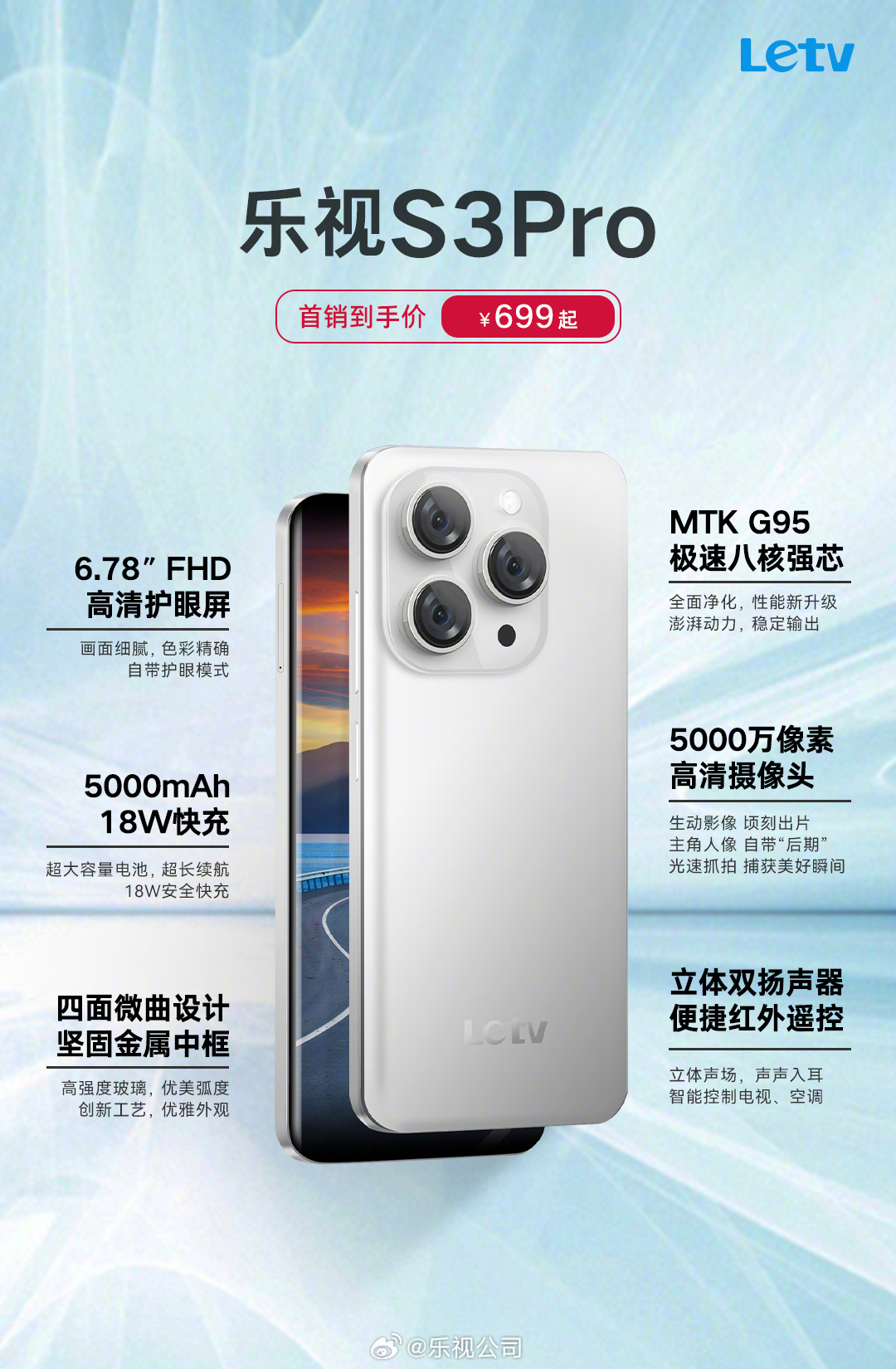 IT之家 7 月 15 日消息,乐视 S3 Pro 手机现已开售。该手机搭载联发科 G95 处理器,内置 5000mAh 电池,屏幕使用全等深微曲盖板工艺,首发价 699 元起。