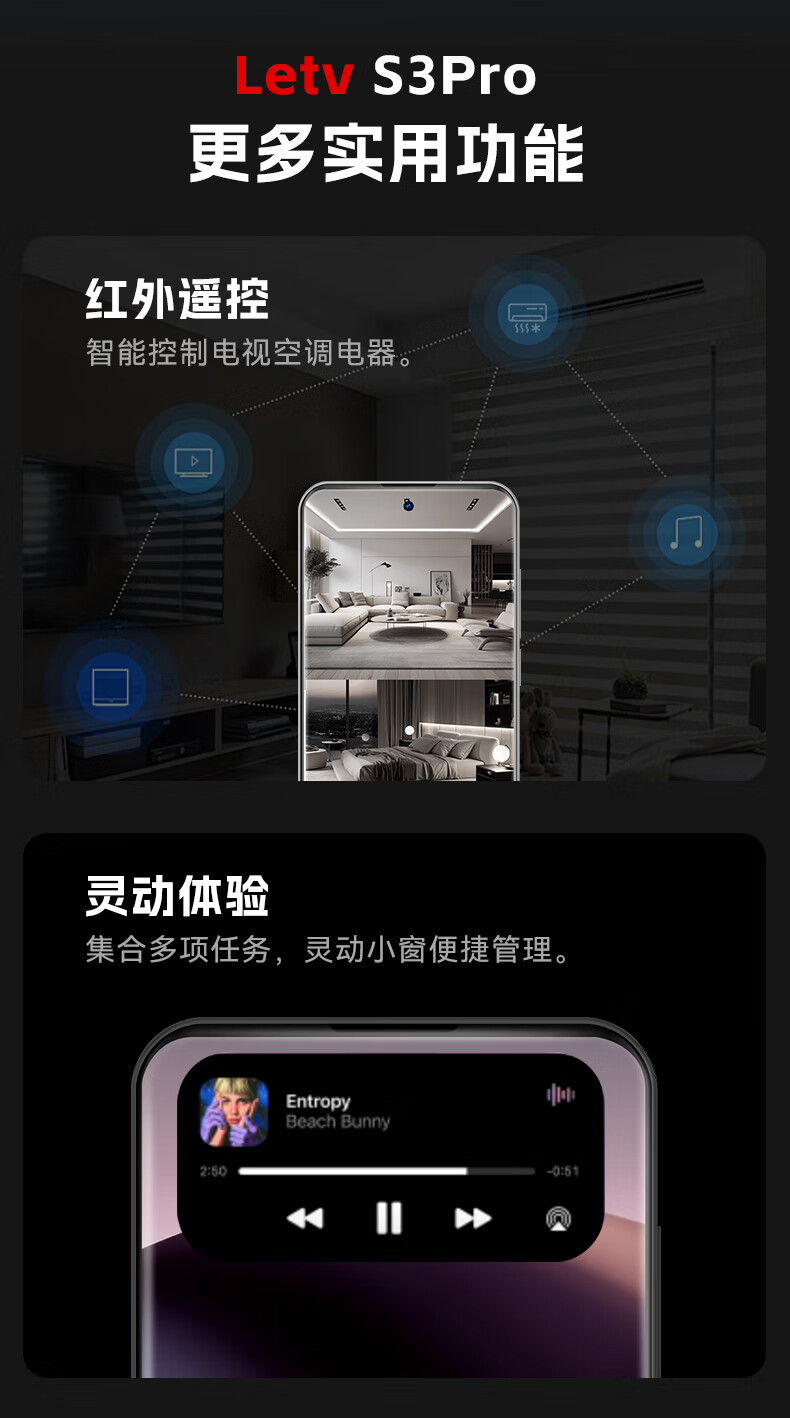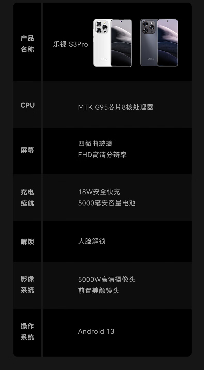 乐视 S3 Pro 内置 5000mAh 电池,支持 18W 快充,后置 5000 万像素摄像头,配备双 BOX 扬声器。
