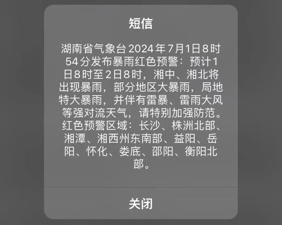 今年 6 月,湖南省气象局与三家运营商“闪信”发布渠道实现互通。当地气象局还制定规范标准,将高时效高级别的气象灾害预警、临灾警报等纳入“闪信”强制提醒范围。