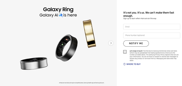 三星方面表示:“问题不在您,而在于我们。我们的生产速度跟不上需求。”同时,三星还提供了预订服务,消费者可通过提供电子邮件地址或手机号码,以便在Galaxy Ring重新上架时获得即时通知。