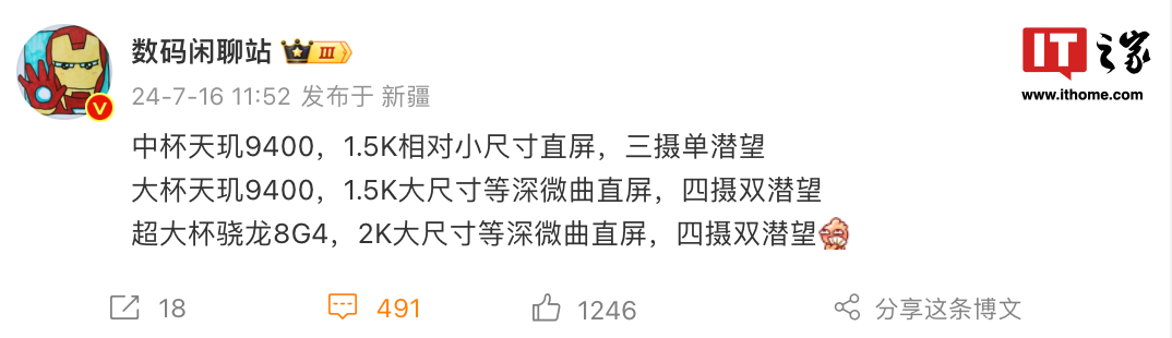 IT之家 7 月 16 日消息,博主 @数码闲聊站 今天曝光了三款神秘新机的规格信息,其中“中大杯机型”搭载天玑 9400 处理器,均搭载 1.5K 屏幕,而“大杯机型”搭载高通骁龙 8 Gen 4 处理器,配备 2K 屏及四摄双潜望,参考评论区,这三款手机有望为 OPPO Find X8 系列手机。