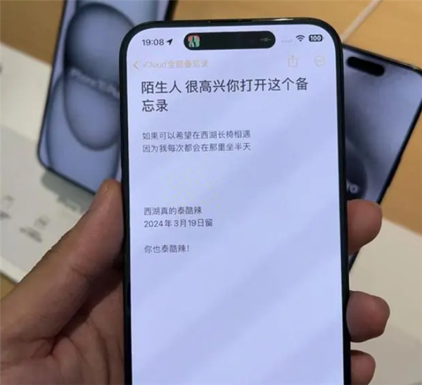 在杭州西湖边的苹果体验店,一位体验者在备忘录中写道:“陌生人,很高兴你打开这个备忘录。如果可以,希望在西湖长椅相遇,因为我每次都会在那里坐半天。”