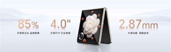 机身轻薄的同时荣耀Magic V Flip还配备了行业最大尺寸的外屏,高达4.0英寸,边框仅为2.87mm,实现了破纪录的85%外屏屏占比,带来极强的视觉震撼。