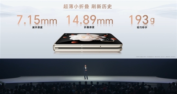 继此前荣耀Magic V2成为行业最轻薄大折叠之后,荣耀Magic V Flip再一次刷新了小折叠的轻薄记录,展开厚度7.15mm、折叠厚度14.89mm,重量193g。