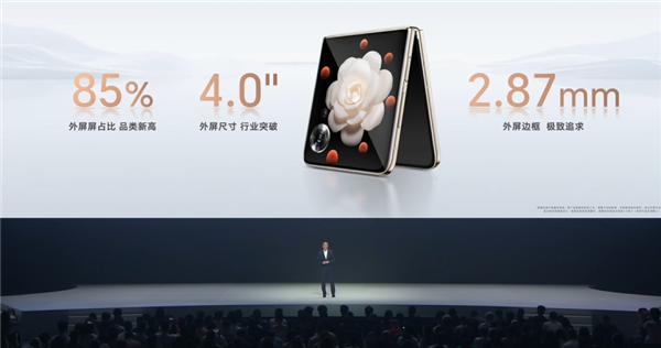 外屏尺寸达到4.0英寸,是小折叠中最大的外屏,并且边框只有2.87mm,其屏占比达到了85%,同样是小折叠中最强。