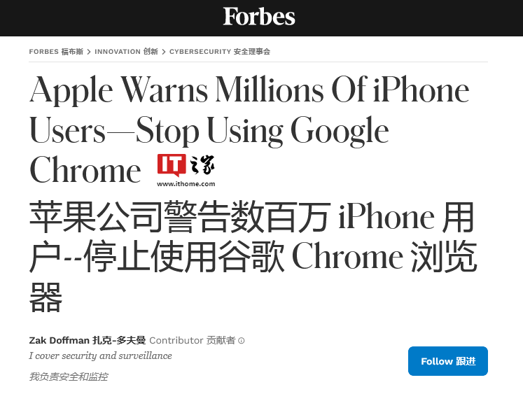 IT之家 7 月 17 日消息,根据 Forbes 报道,苹果公司在新一轮宣传攻势中,向全球超过 14 亿 iPhone 用户释放一个信号:在 iPhone 上请停止使用谷歌 Chrome 浏览器。