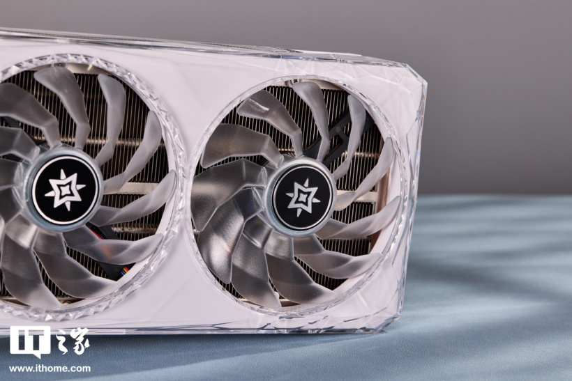 风扇轴柱上印有星曜标志图案,而“水晶”外壳部分其实是可以拆卸的,而且官方支持用户自由 DIY,不影响保修,动手能力强的小伙伴轻易就能 DIY 一款外观个性化的显卡出来。