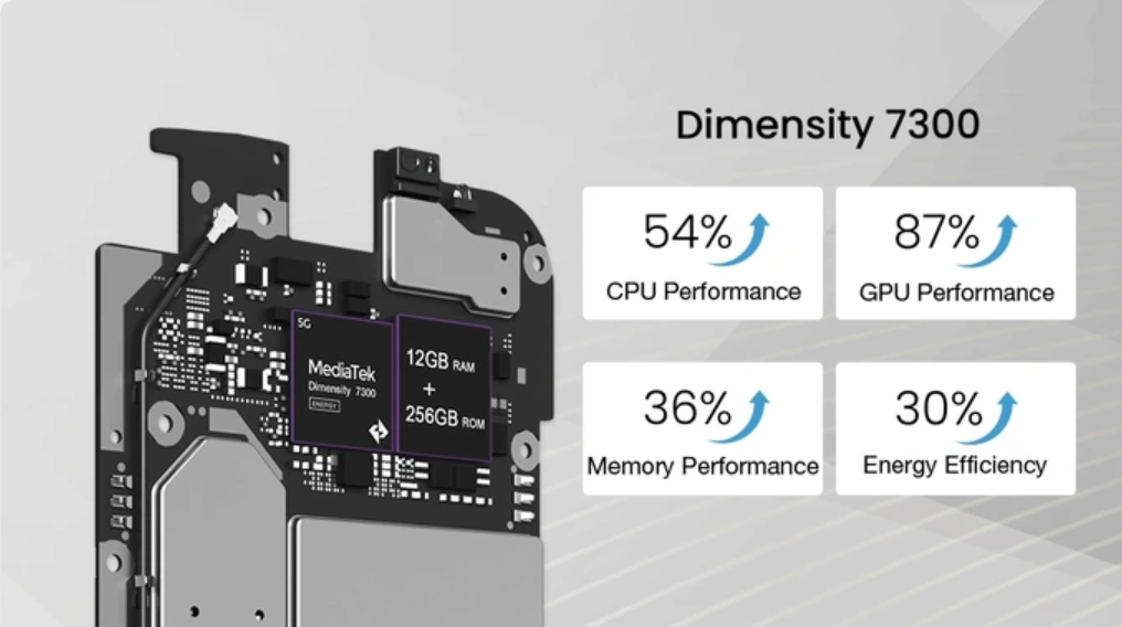 性能方面,Jelly Max 搭载天玑 7300 处理器(2.5GHz 4x A78 + 4x A55、Mali-G615 MC2、4nm 制程)与 12GB LPDDR5 + 256GB UFS 3.1 的内存组合,性能相比前代的 Helio G99 大幅提升。