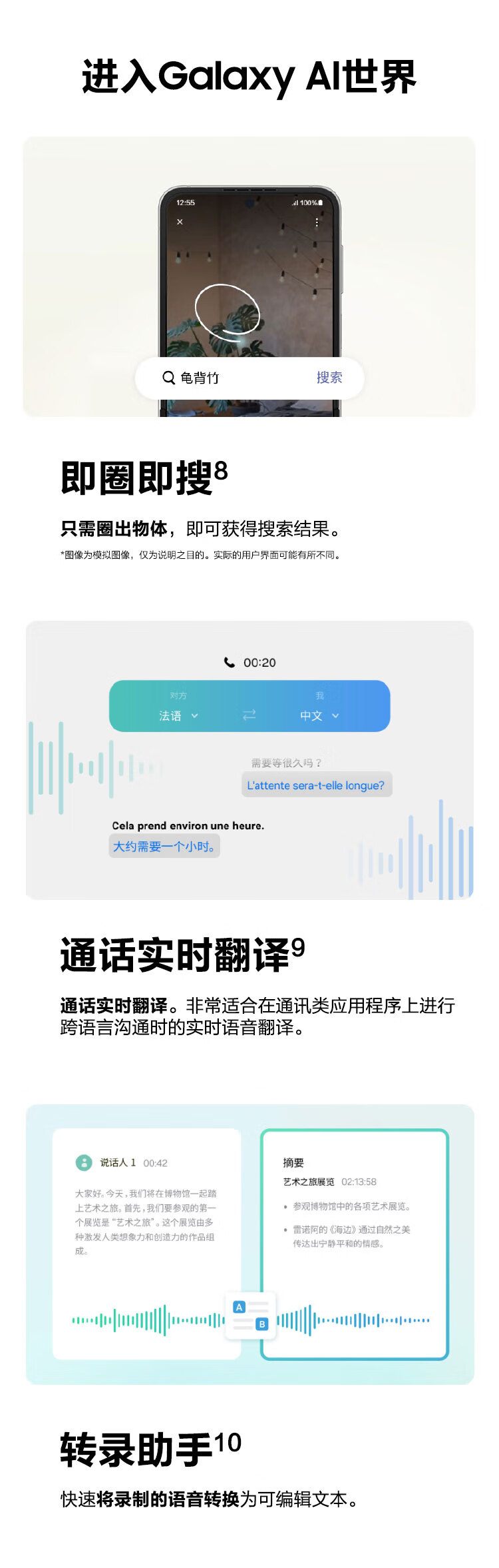 三星 Galaxy Z Flip6 搭载 Galaxy AI 功能,提供同传、外屏聊天助手、即圈即搜、通话实时翻译、转录助手等功能。