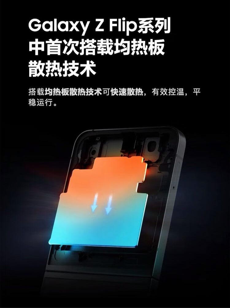 Galaxy Z Flip6 内置 4000mAh 电池,在该系列中首次搭载均热板散热技术,支持双卡双待与 IP48 级防尘防水。