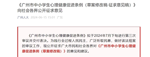 “广州人大”公众号近日发布一篇《广州市中小学生心理健康促进条例(草案修改稿・征求意见稿)》,向社会各界公开征求意见和建议。