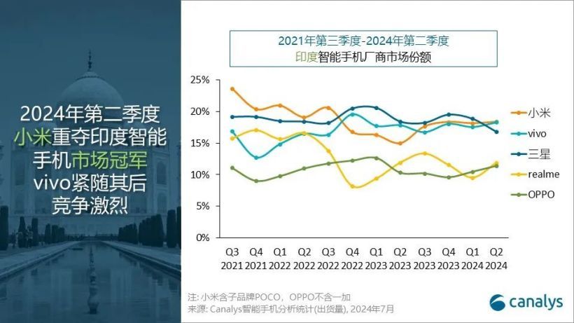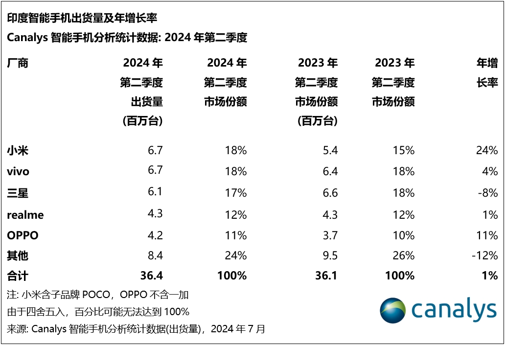 文章来源于互联网:凤凰网-Canalys:2024年第二季度印度智能手机市场微增1%,小米重返榜首