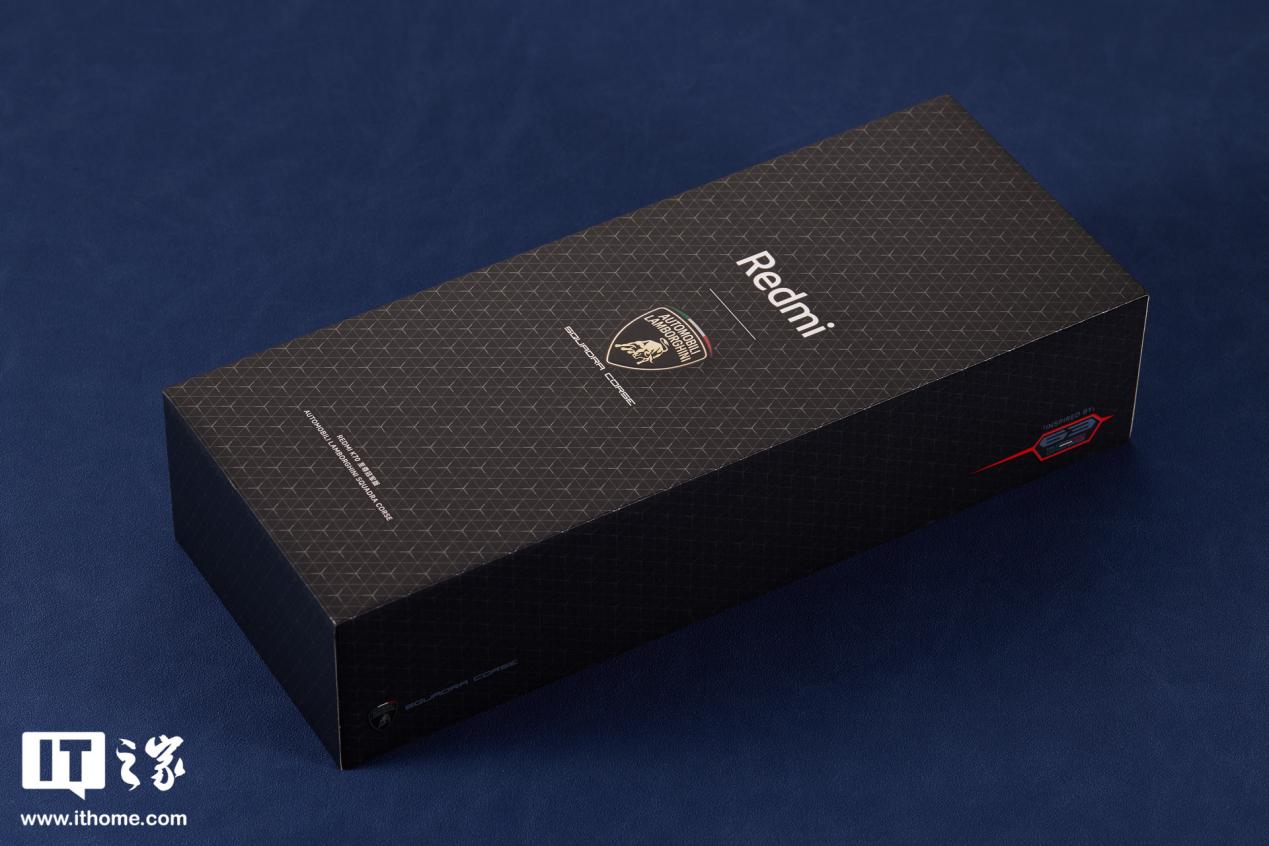 和兰博基尼联名定制,也是 Redmi 的老传统了。先看包装盒,与普通标准手机盒不同,尺寸大了一圈,也更长,更像是礼盒套装。包装正面除了 Redmi 相关的元素,最抢眼的就是兰博基尼汽车 SQUADRA CORSE 的盾牌标志了。