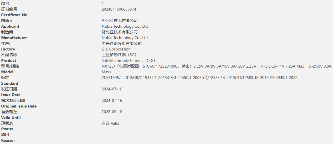 IT之家查询获悉,努比亚 Z60S Pro 手机已于 7 月 16 日通过国内 3C 认证,型号为 NX725J,是一款 5G 卫星移动终端产品,电源适配器为 STC-A1172520400C。