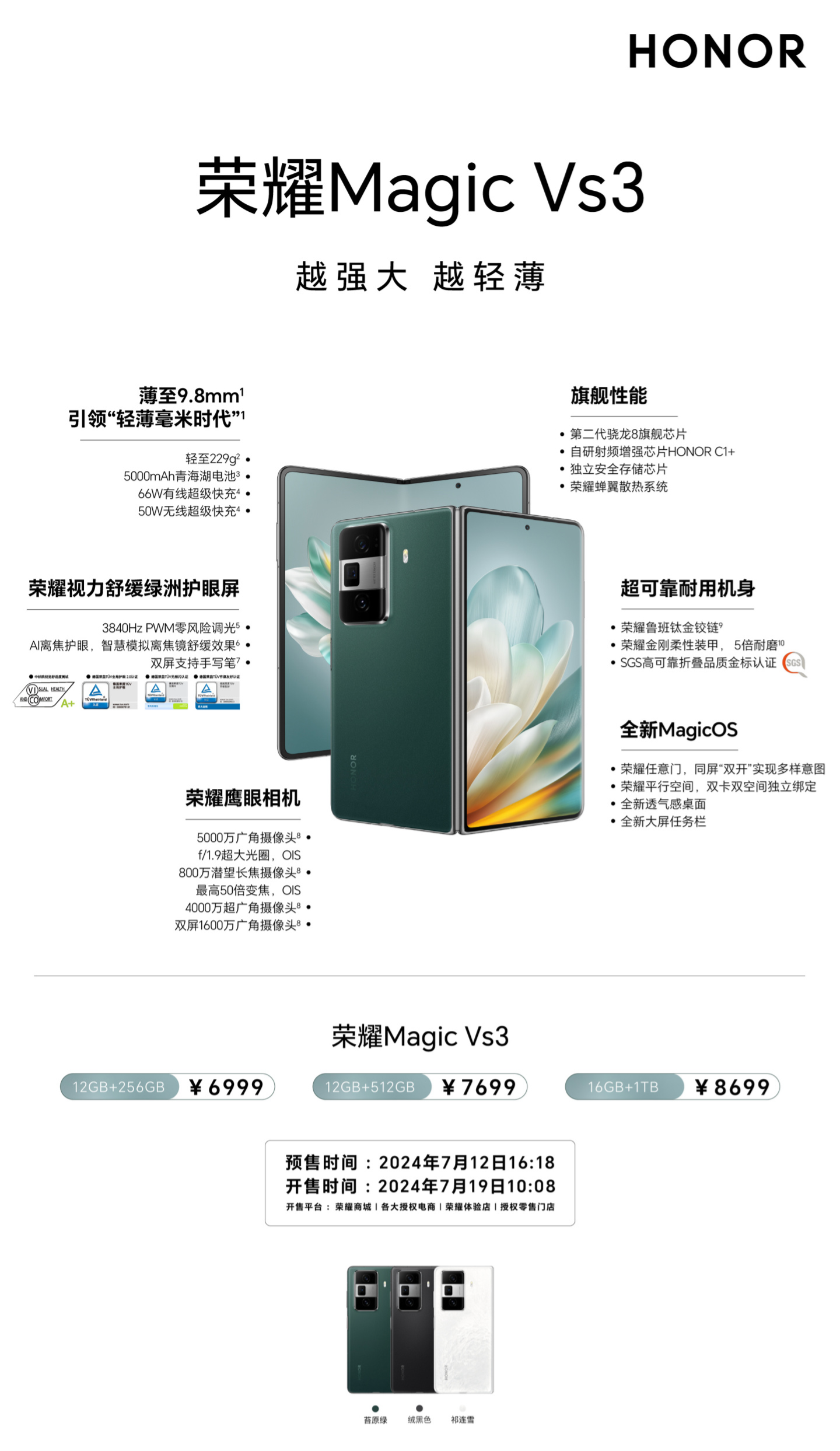 IT之家 7 月 19 日消息,荣耀 Magic Vs3 折叠屏手机将于今日 10:08 开售,首发价格为 6999 元起。