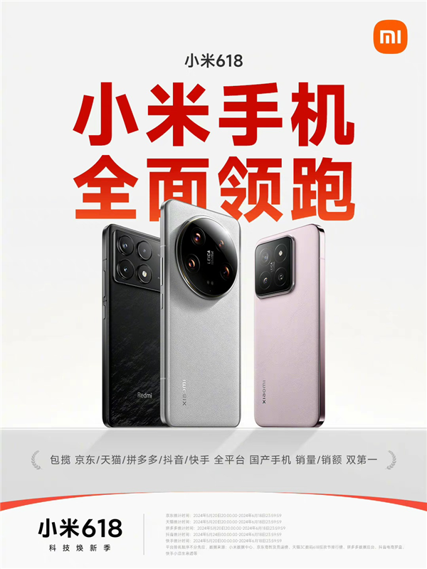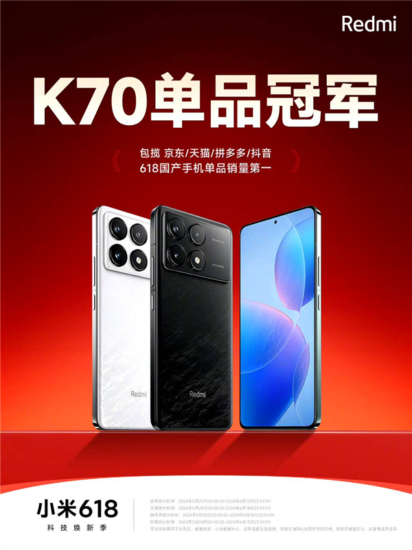 Redmi K70单品更是一举拿下京东、天猫、拼多多、抖音四大电商平台在整个618期间的国产手机单品销量第一。