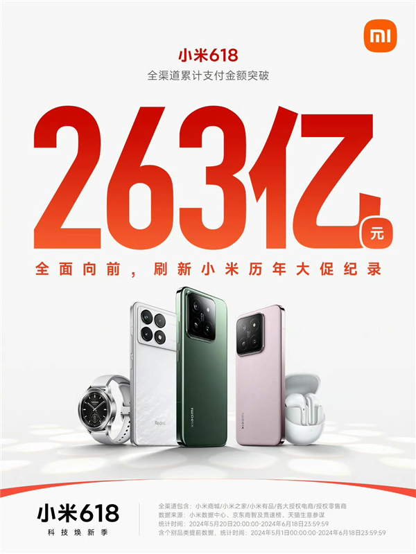 快科技6月19日消息,截至6月18日24时,2024年小米618大促全渠道累计支付金额突破263亿元人民币,刷新小米历年大促新纪录,再创历史新高。