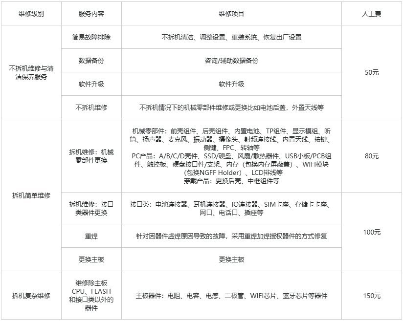 需要注意的是,以上价格为维修建议价格,包含人工费。非保维修收费 = 维修备件价 + 人工费,根据维修级别的不同,人工费在 50 元到 150 元不等。
