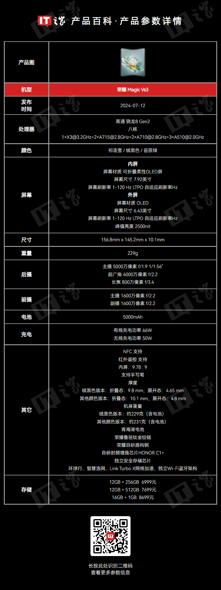 荣耀 Magic Vs3 折叠屏的具体配置信息,IT之家此前已经进行了详细报道,感兴趣的朋友可以查看产品百科。