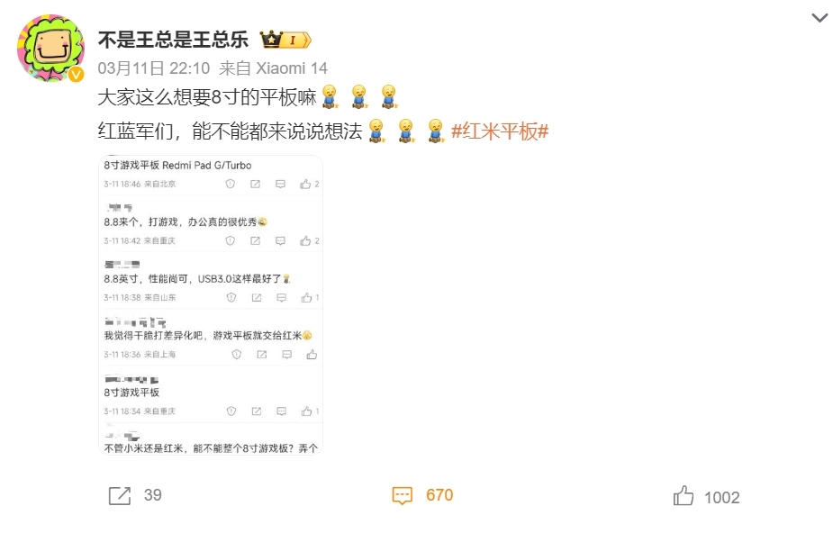 这条微博后续甚至引来了Redmi市场经理的注意,并且惊讶于8英寸平板居然有这么大的用户需求。或许这也是后续Redmi Pad SE推出8.7英寸版本的契机,先拿入门产品试试水,然后再考虑是否上旗舰型号。