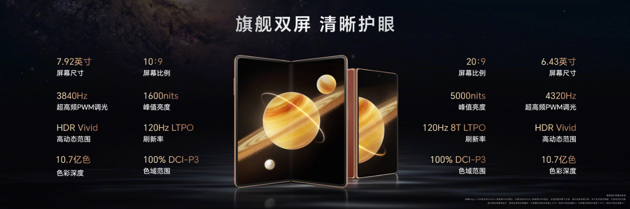 屏幕方面,荣耀 Magic V3 外屏支持 5000nits 峰值亮度,全局峰值亮度 1800nits,是目前折叠手机中最亮的屏幕。其中内外双屏均支持零风险护眼调光,外屏是折叠屏首次支持 4320Hz 超高频 PWM 调光,此外,荣耀 Magic V3 还首发 AI 离焦护眼技术以及干眼友好绿洲护眼技术。