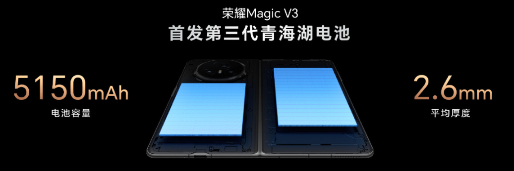 荣耀 Magic V3 首发第三代青海湖电池,硅含量突破 10%,电池容量提升至 5150mAh,电池的平均厚度 2.6mm,配合自研的能效增强芯片 HONOR E1 和荣耀都江堰电源管理系统,能效管理精度号称提升 3 倍。