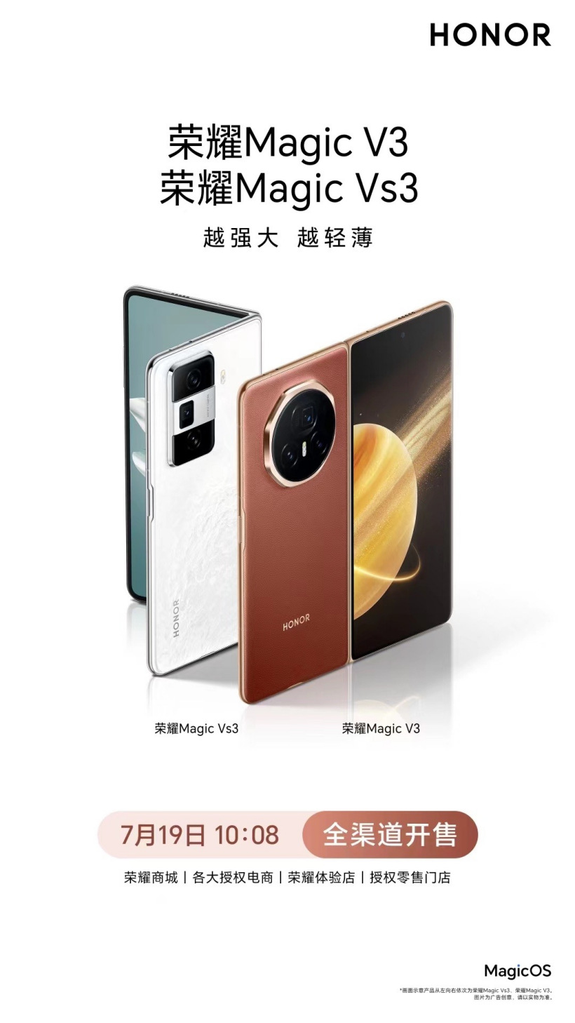 IT之家 7 月 19 日消息,7 月 12 日,荣耀正式发布了 Magic V3 / Vs3 折叠屏手机,凭借突破性的“内折轻薄新纪录”以及第三代青海湖电池、鲁班架构等创新特性吸引了很多用户的关注。7 月 19 日,荣耀 Magic V3 / Vs3 折叠屏手机正式全渠道开售。