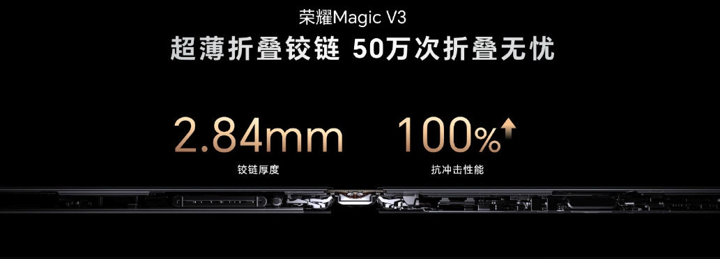 同时,荣耀 Magic V3 “业界首创”航天特种纤维机身,将强度 5800MPa 的“纤维之王”应用到荣耀 Magic V3 绒黑色版本上,借助第二代荣耀盾构钢打造“迄今为止最薄”的折叠铰链,仅有 2.84mm 厚,可实现 50 万次折叠。