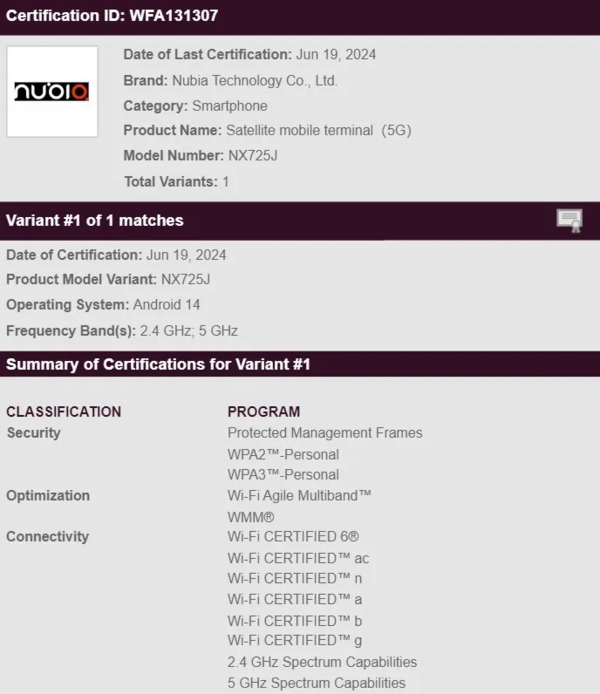 快科技6月20日消息,近日,努比亚N60S Pro机型通过了Wi-Fi联盟认证,具体型号为“NX725J”。