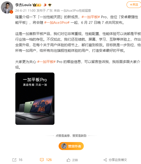一加中国区总裁李杰表示,一加平板 Pro的性能配置、性能体验可以说都是平板行业独一档的存在。