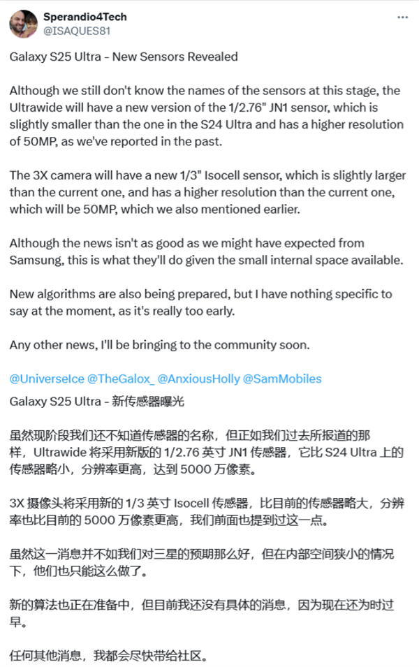 据这位博主透露,三星Galaxy S 25 Ultra的超广角镜头将采用自家的三星S5KJN1传感器,其感光单元为1/2.76英寸,相比S24 Ultra的索尼IMX564传感器1/2.55英寸的感光单元,接受光线的能力要更弱。