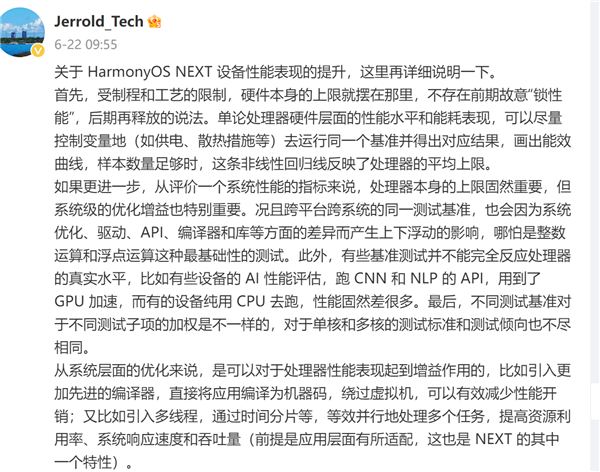 对于网友的质疑,这位博主还解释称,受制程和工艺的限制,硬件本身的上限就摆在那里,不存在前期故意“锁性能”,后期再释放的说法。