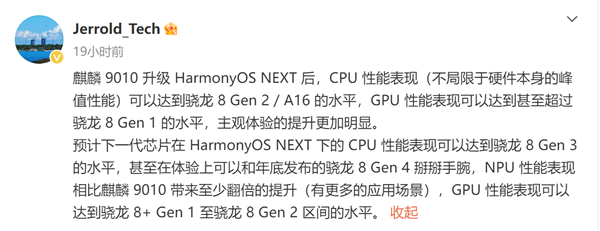 至于NPU性能表现相比麒麟9010带来至少翻倍的提升(有更多的应用场景),GPU 性能表现可以达到骁龙8+ Gen 1至骁龙8 Gen 2区间的水平。