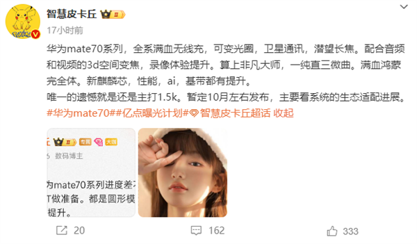 日前,数码博主“智慧皮卡丘”曝光了华为Mate 70系列的部分核心配置,算上非凡大师,华为Mate 70系列将带来四款机型。
