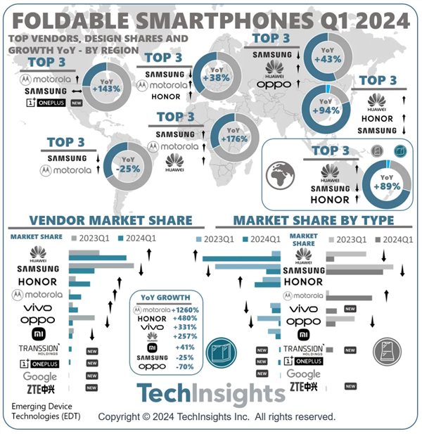 值得一提的是,荣耀在折叠屏手机上的持续深耕也取得了显著成果。根据市场调研机构TechInsights的最新报告,2024年第一季度,荣耀的折叠屏市场份额全球排名第三,中国地区排名第二。在横向折叠屏市场,荣耀在全球和中国市场均位列第二。