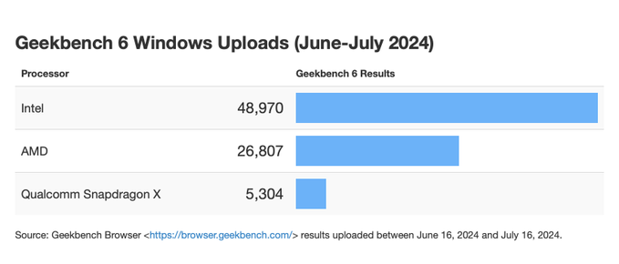 IT之家 7 月 21 日消息,据性能测试平台 Geekbench 数据显示,高通新一代骁龙 X 处理器自 6 月 18 日发布以来,市场表现良好。过去一个月内全球在 Windows PC 上进行了 81,081 项测试,有 6.5% 的 Geekbench 6 测试跑分来自搭载骁龙 X 处理器的设备。虽然这一数字与英特尔和 AMD 相比仍有差距,但考虑到骁龙 X 处理器上市时间较短,这已经是一个不错的开局。