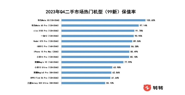 二手平台转转集团发布的《2023年四季度手机行情报告》显示,华为Mate X5成“保值王”。