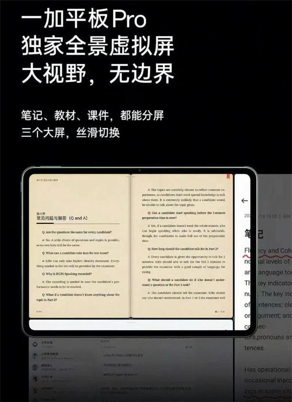 一加平板Pro配备TCL华星30~144Hz宽频设计,可实现高低频无极切换,虚拟屏三开,游戏、教学、电影等应用丝滑切换,且具有极致低功耗。
